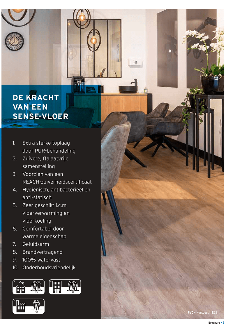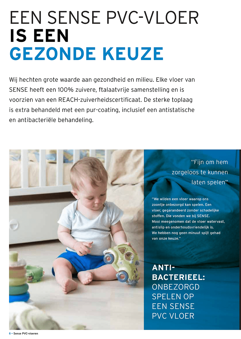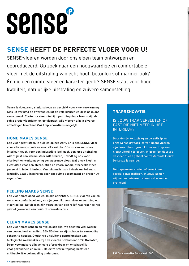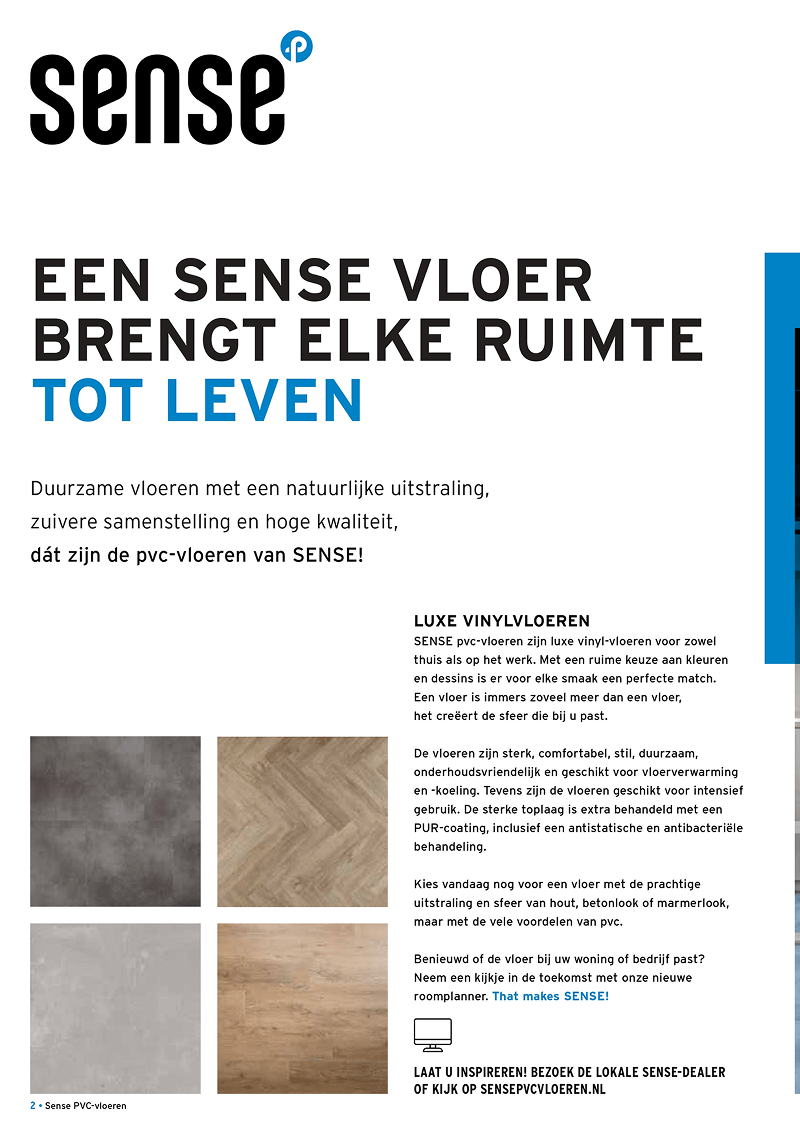 A high-quality and comfortable floor with the appearance of real wood or natural stone? Reliable, sound-absorbing, waterproof, durable, hygienic and environmentally friendly? We offer suitable floors for every living and working environment. View our free digital brochure with all information about Sense PVC Flooring and the possibilities.